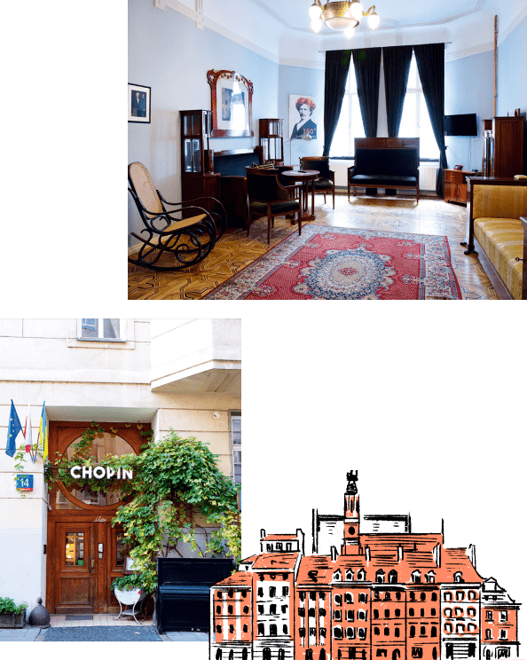 Housed in a refurbished modernist building built in 1910, the hotel marks its entrance and also rooms with upright pianos. Each of the thirty-four rooms decorated with antique furniture is named after a Polish author or pianist, foremost Chopin. The hotel keeps bees on the roof and serves a breakfast of organic foods. Enjoy local Warsaw honey fresh from the comb along with a cup of house-roasted coffee. Concerts are held in the salon at 7:30 nightly. This classic hotel will score high with Chopin fans and casual listeners alike.