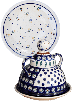 Blessed with fine soil, Poland has long been a center of ceramics. Especially the town of Bolesławiec, which is famous for its kilns. From left: doll-shaped cheese or butter dish called “Cheese Lady” 138 zł; saucer 56.59 zł.