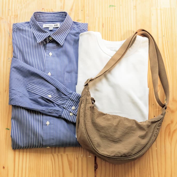 L to R: 2020 Fall & Winter shirt for UNIQLO and JW ANDERSON. Willemien picked it up because she liked the striped front and the pattern of the yoke. The white cotton shirt on the right is from Uniqlo U. Willemien likes it so much that she owns three. Extremely versatile, it works just as well with a tailored jacket as with a pair of jeans. She was drawn to the mini shoulder bag at the bottom right for its café au lait color. It’s since become a daily favorite.