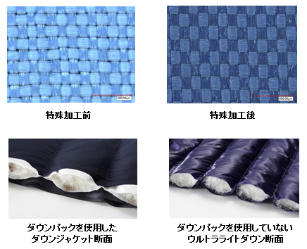 一般的なダウンジャケットは、羽毛を入れるダウンパックと呼ばれる袋と、表生地との2重構造により、羽毛が生地の間をぬって飛び出ることを防いでいます。ウルトラライトダウンは、生地に特殊加工を施すことで、糸と糸の間の目がつまり羽毛を抜けにくくしています。この加工により、ダウンパックを使用する必要がなくなり、ダウンパック分の重量を軽くすることができました。一般的に、メンズのウルトラライトダウンジャケット(Mサイズ)と同等のダウンジャケットは、約130グラムのダウンパック量があります。(当社調べ)。ウルトラライトダウンは、この約130グラムですら削ぎ落とす努力を重ね、軽量性を追求しています。